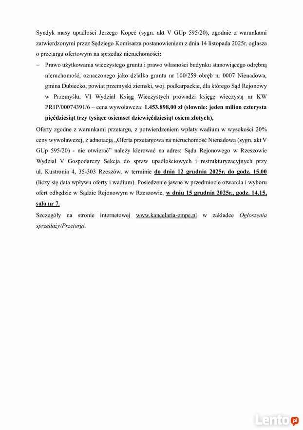Syndyk masy upadłości Jerzego Kopeć (sygn. akt V GUp 595/20), zgodnie z warunkami zatwierdzonymi przez Sędziego Komisarza postanowieniem z dnia 14 listopada 2025r. ogłasza o przetargu ofertowym na sprzedaż nieruchomości:Prawo użytkowania wieczystego gruntu i prawo własności budynku stanowiącego odrębną nieruchomość, oznaczonego jako działka gruntu nr 100/259 obręb nr 0007 Nienadowa, gmina Dubiecko, powiat przemyski ziemski, woj. podkarpackie, dla którego Sąd Rejonowy w Przemyślu, VI Wydział Ksiąg Wieczystych prowadzi księgę wieczystą nr KW PR1P/00074391/6 – cena wywoławcza: 1.453.898,00 zł (słownie: jeden milion czterysta pięćdziesiąt trzy tysiące osiemset dziewięćdziesiąt osiem złotych),